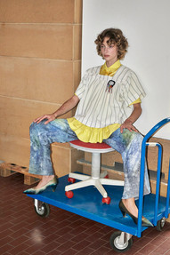 In this small, focused collection a colourful and energetic feeling meets with a childlike pureness, mixing naive prints and fabric experimentations with romantic rashes, shiny pailettes and minimal utility gear.