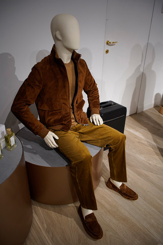 In the accessories, the loafers are entirely covered in suede and deerskin.