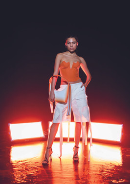 The jumpsuit and the high-tech jersey dresses represent a continuous evolution of flows that caress the curves, in a dialogue of effusions between soul and body, which reveal and yet conceal.