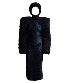 She wears moonsuits with masculine, powerful shoulders with a focus on the reoccurring voluminous statement sleeves, emphasizing the dynamic relationship between the human body and its fabric shell.