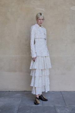 Fabrics become poetic instruments: reed lace, Swiss cotton, silk voile, jute canvas, organza crepon, gauze, metal duchesse, fil coupé, plissé, enzyme-washed viscose.