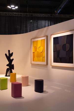 Sculptures by Guerrino Dirindin, set against walls clad in vegetable-tanned leather by Conceria Presot.