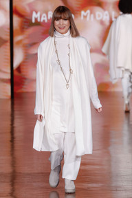 The irresistible charm of Midali's essential style extends to knitwear, reclaiming soft and flowing forms, enchanting with the layering of soft and interchangeable layers, opening up to new identities, as in the combo of jacket and flared skirt. Fluidity is also the material direction of jersey and its weights, boiled wool, disheveled fabric, denim, and colored fur.